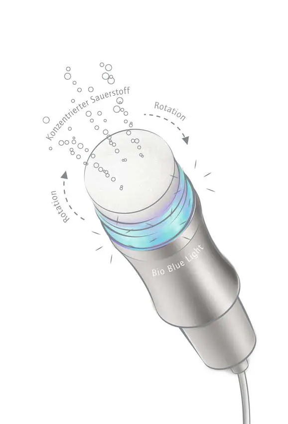 The air pressure is increased by a rotary brush that vibrates at high speed. The application of concentrated oxygen tones the skin and leaves it feeling fresh, cool and invigorated. The specially formulated serums gently remove excess fluid from the eye area. Puffiness under the eyes is visibly reduced. Organic Blue Light cools and soothes skin after treatment. Organic Red Light stimulates enhanced effects of products used on the skin.